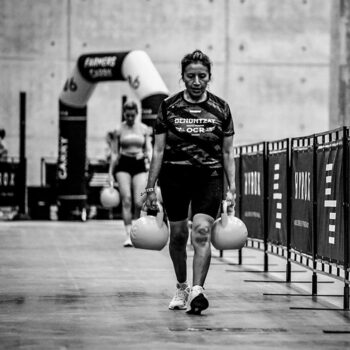 La segunda estación consiste en 50 metros de Sled Push. Es fundamental haber practicado este movimiento antes de la competición y, sobre todo, contar con zapatillas que ofrezcan una tracción óptima. El esfuerzo recae casi exclusivamente en la potencia del tren inferior, por lo que un buen agarre al suelo marcará la diferencia.